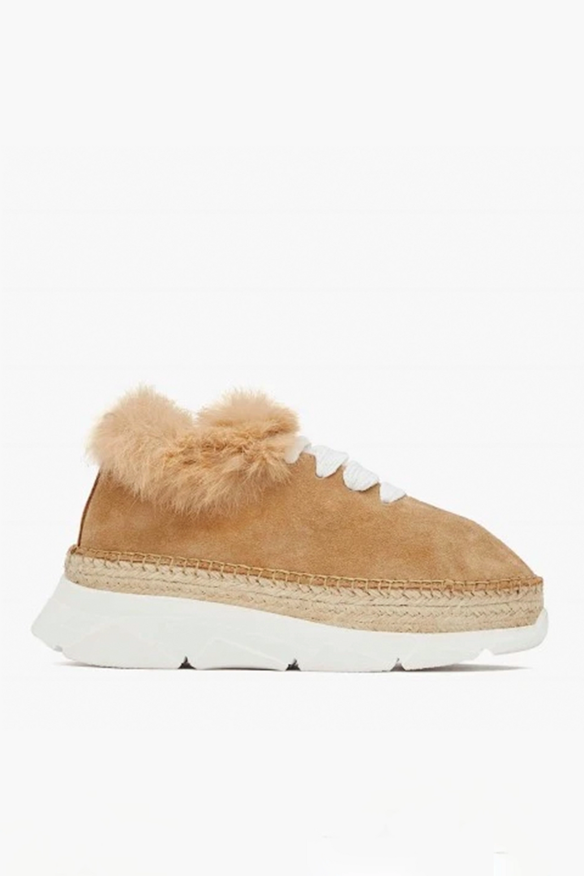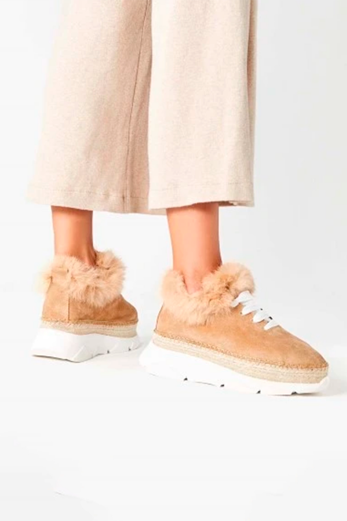 • Sneakers de invierno en serraje canela con pelo decorativo.