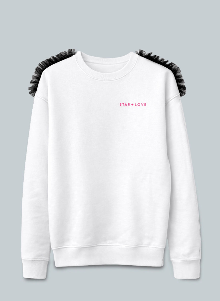 Descubre la sudadera blanca mujer sin capucha y la camiseta corazón con tul negro, perfectas como regalo San Valentín original y con estilo.