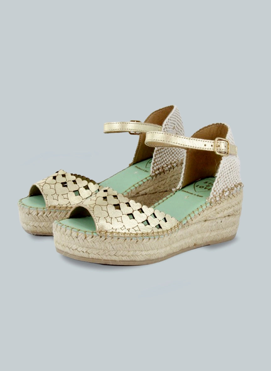 Este modelo de alpargatas en cuña baja cuenta con una pala en piel dorada con diseño de corazones, aporta textura y elegancia, mientras que la pulsera ajustable al tobillo estiliza el pie y asegura una sujeción cómoda durante todo el día.