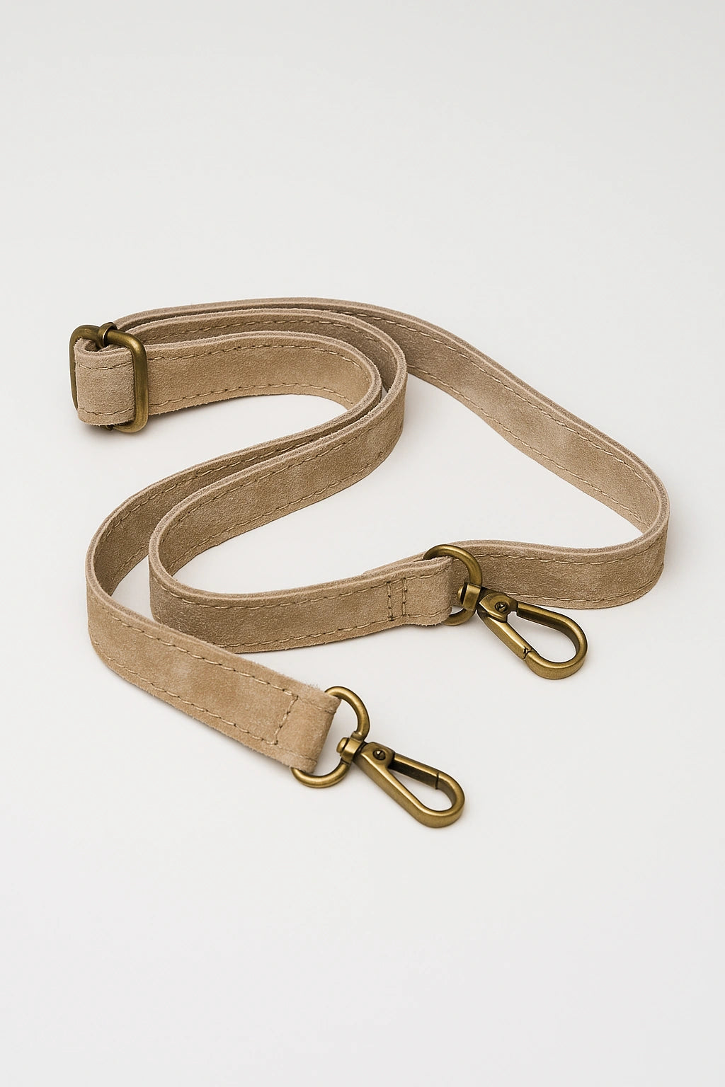 Confeccionado en material tipo serraje, destaca por su textura elegante y su forma semicircular que aporta comodidad y ligereza.