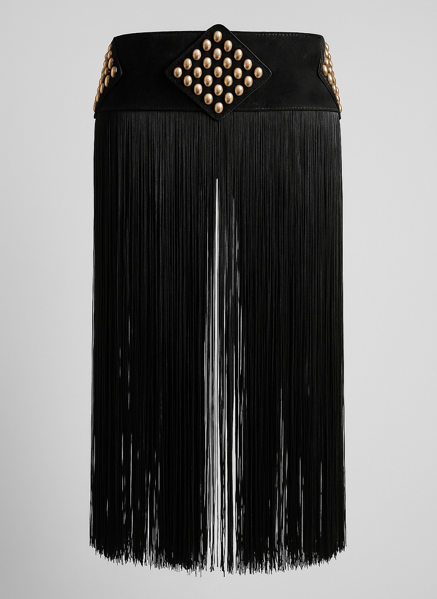 • Cinturón ancho negro con flecos largos (90 cm) y tachas doradas.