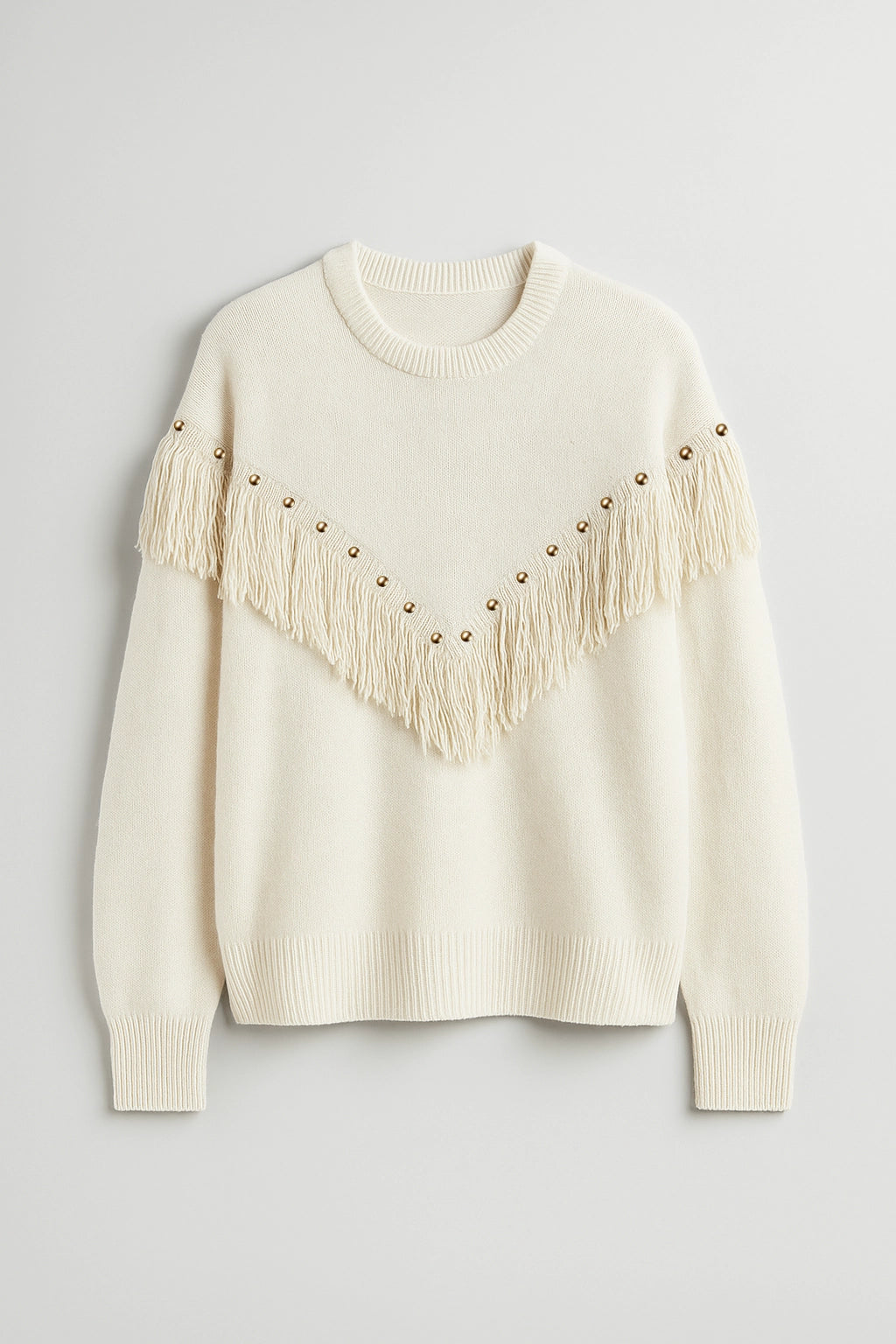 El jersey blanco de Star Love destaca por su detalle de flecos en la parte frontal y tachas doradas que aportan un toque actual sin recargar el look.