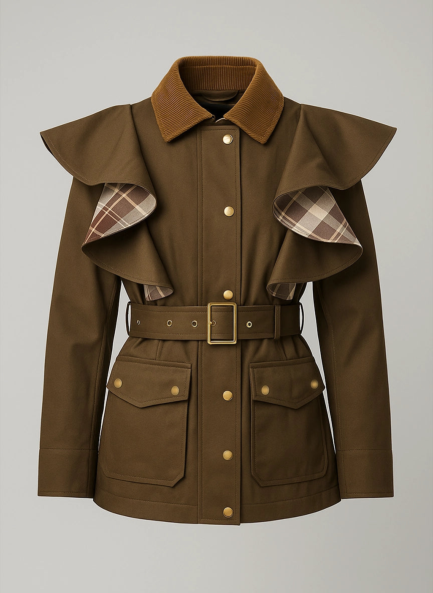 Ese modelo de trench jacket presenta volantes amplios en los hombros, botones dorados y un cinturón ajustable que realza la silueta.