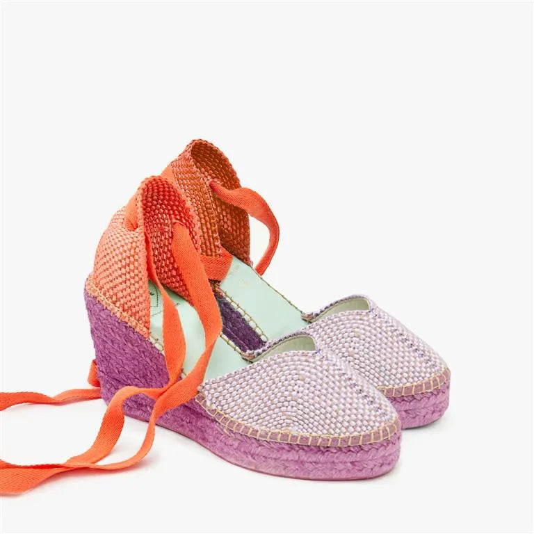 Beta 143 Jina es nuestro modelo de cuñas fuxia y talonera naranja, son cuñas altas con tejido trenzado artesanal con un acabado brillante.